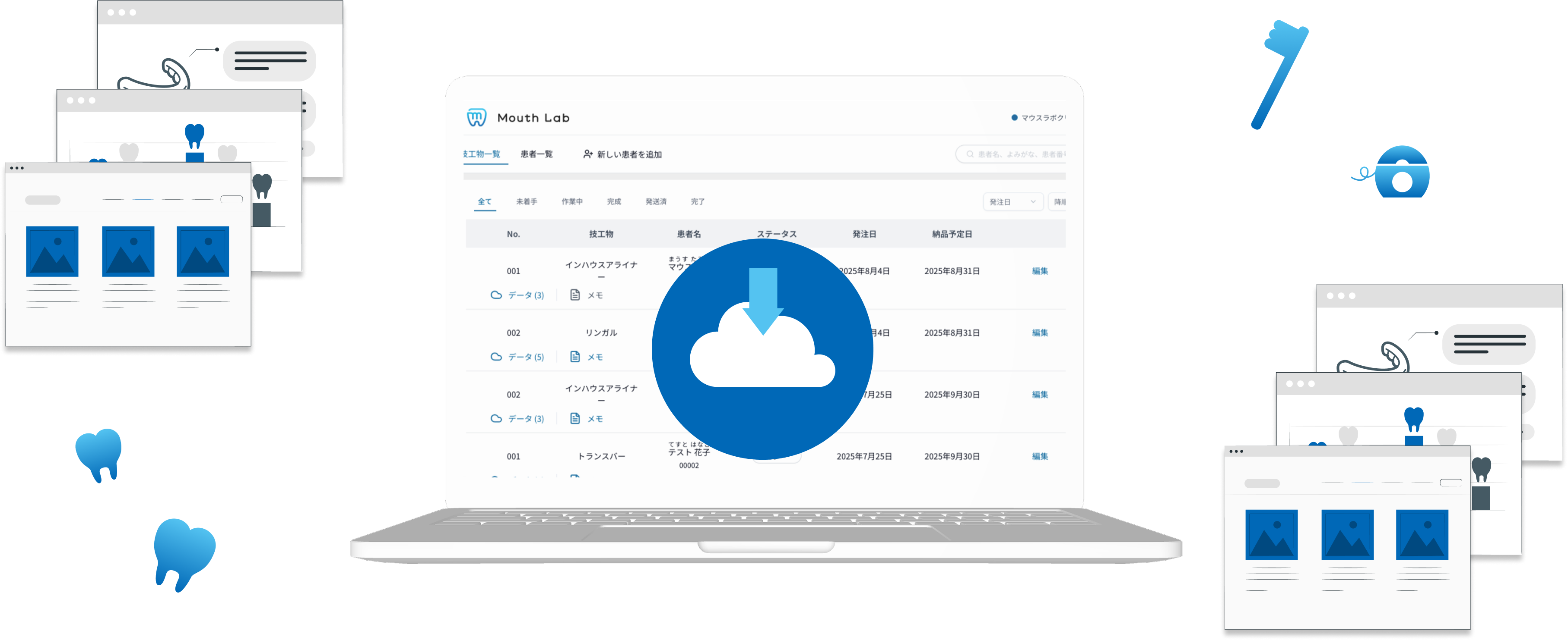 技工物データを安全にクラウドで保管し、 いつでもどこからでもアクセス可能。 セキュリティ対策も万全だから、大切な情報も安心です。 データ管理の不安を解消し、もっと技工に集中できる環境を。