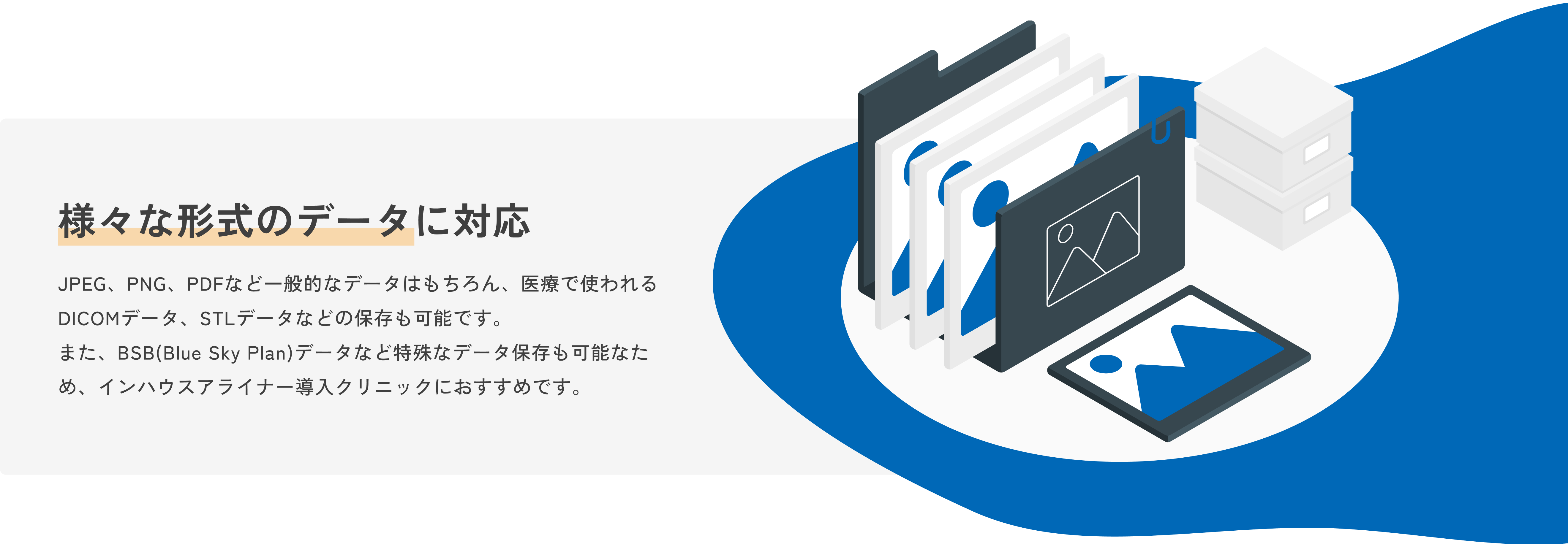 JPEG、PNG、PDFなど一般的なデータはもちろん、医療で使われるDICOMデータ、STLデータなどの保存も可能です。 またBSB(Blue Sky Plan)データなど特殊なデータ保存も可能なため、インハウスアライナー導入クリニックにおすすめです。