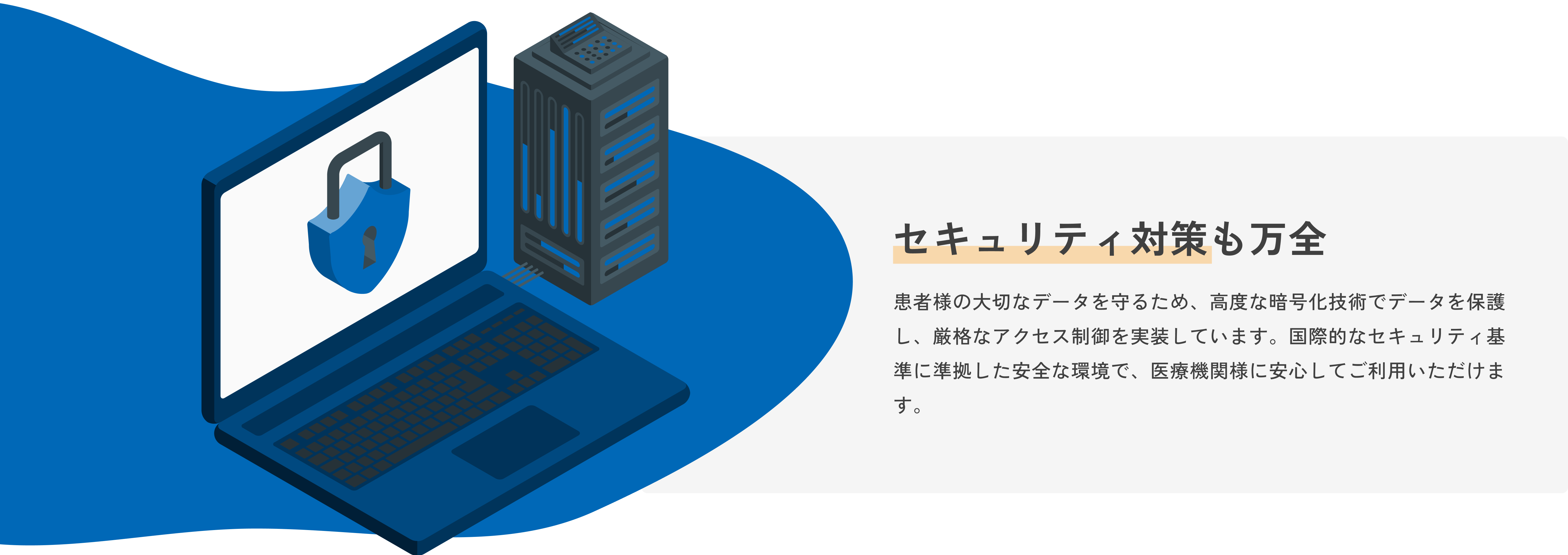 患者様の大切なデータを守るため、高度な暗号化技術でデータを保護し、厳格なアクセス制御を実装しています。国際的なセキュリティ基準に準拠した安全な環境で、医療機関様に安心してご利用いただけます。